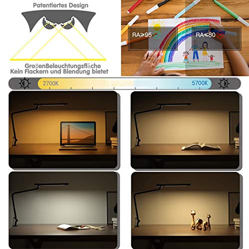 Veelzijdige verlichting en oogbescherming: led-bureaulamp met niet-verblindende verlichting. Een hoge CRI95 herstelt de ware kleur van de objecten voor oogverzorging. Traploos dimmen instelbaar en kleurtemperaturen (van 2700 K tot 5700 K).