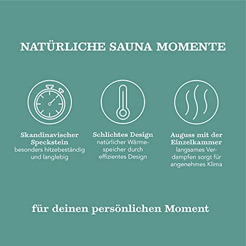 Eenvoudig in gebruik: de opgietsteen verwarmen, de afzonderlijke kamer met water vullen en mentholkristallen of sauna-ingietmiddel toevoegen. De verdamper steen zorgt voor een rustgevend binnenklimaat.